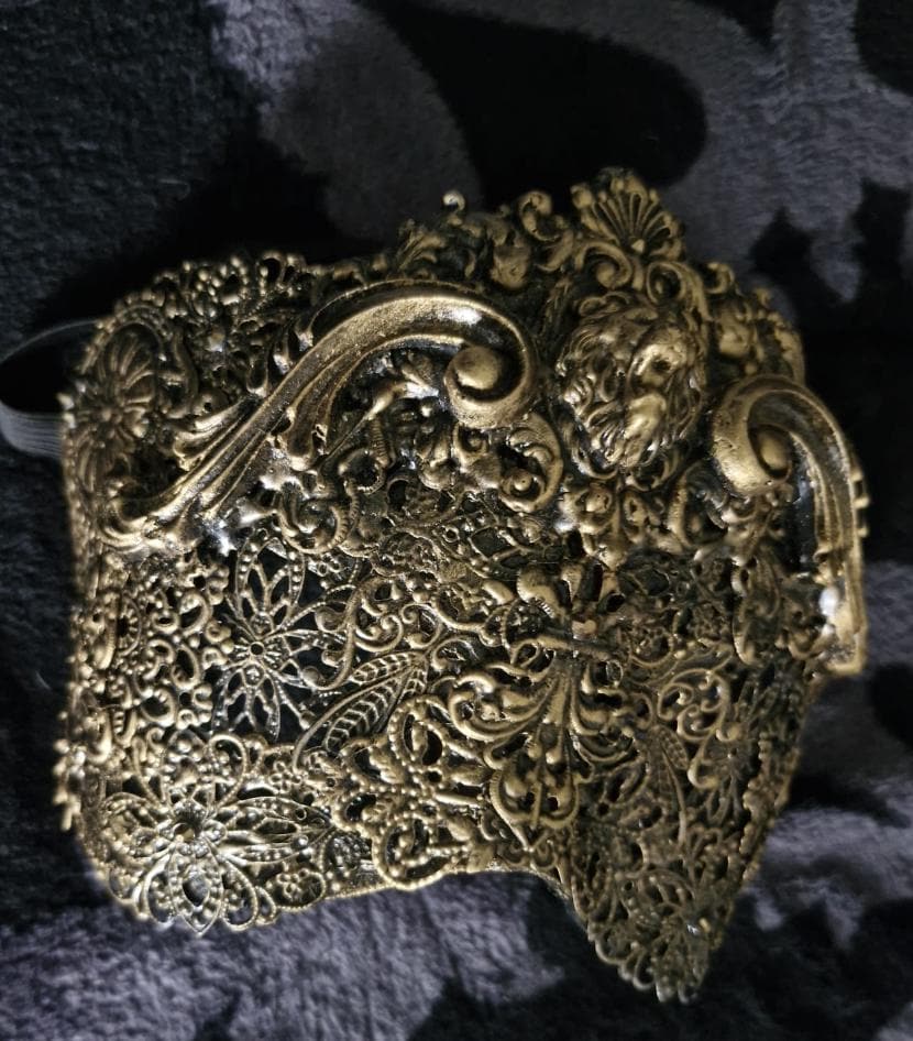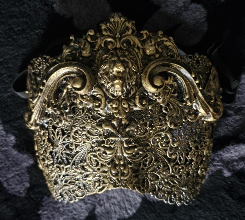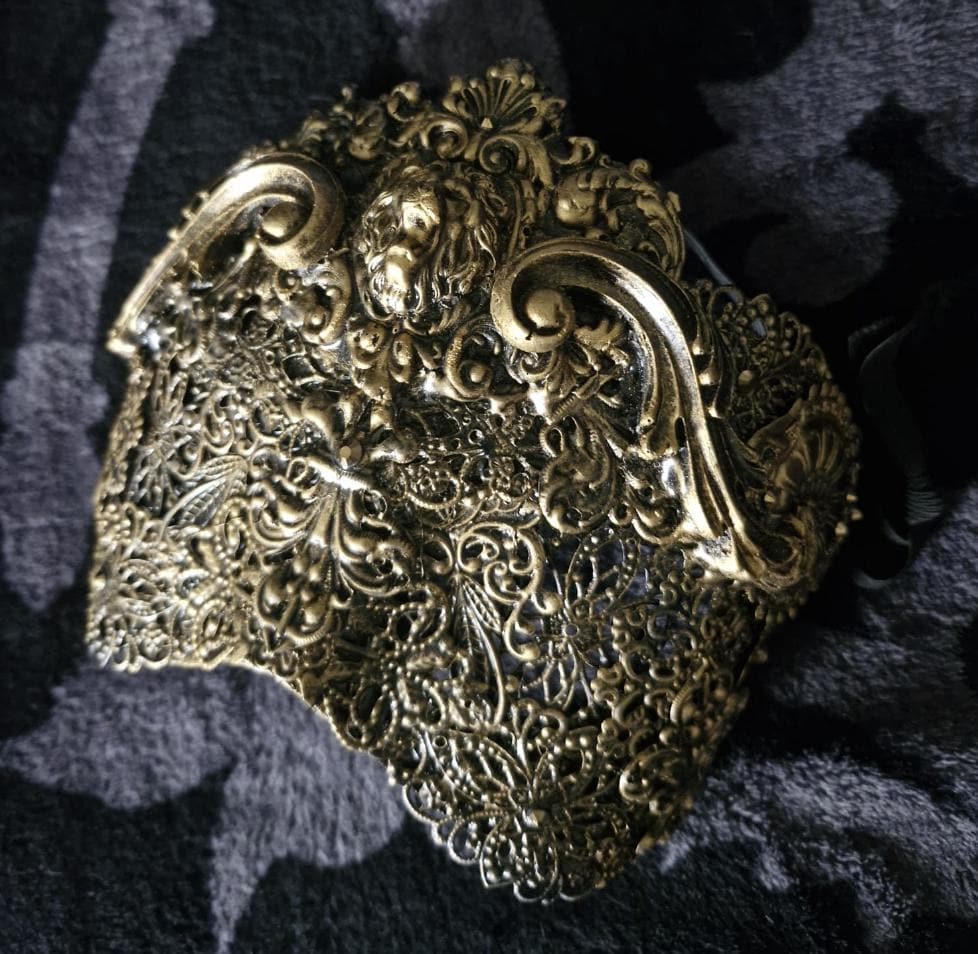 This beautiful mask is made using metalwork and finished with a lush gilt varnish in gold.