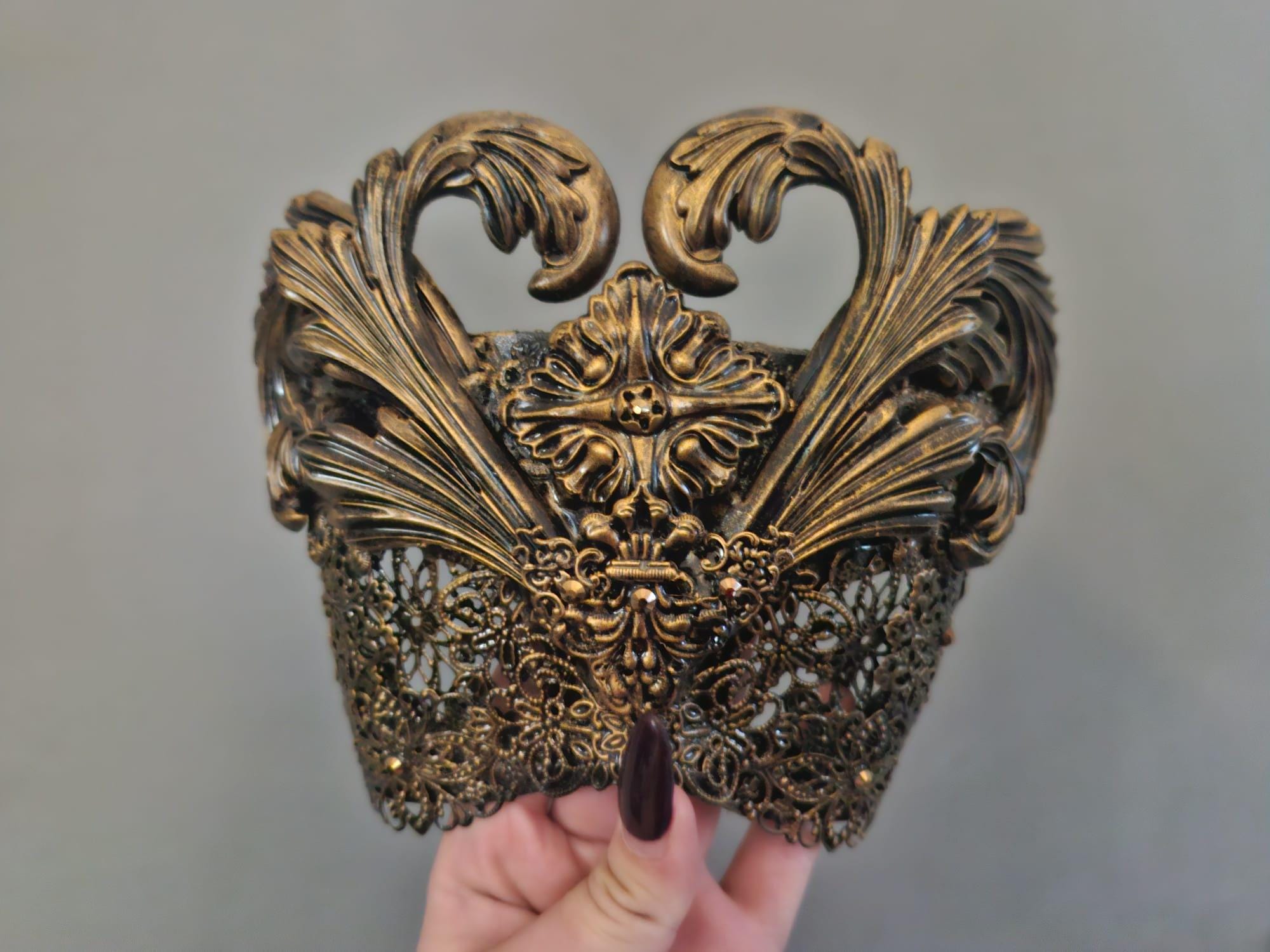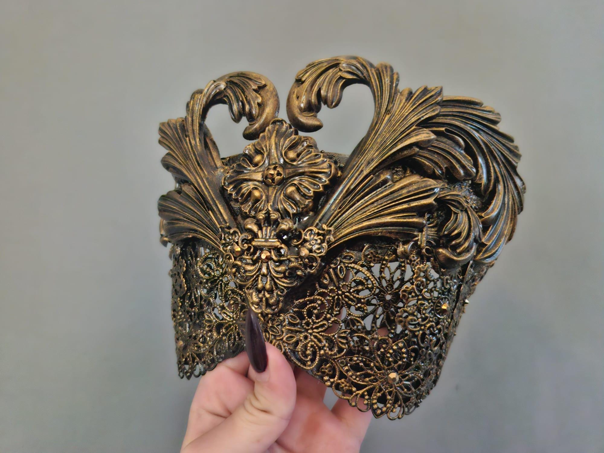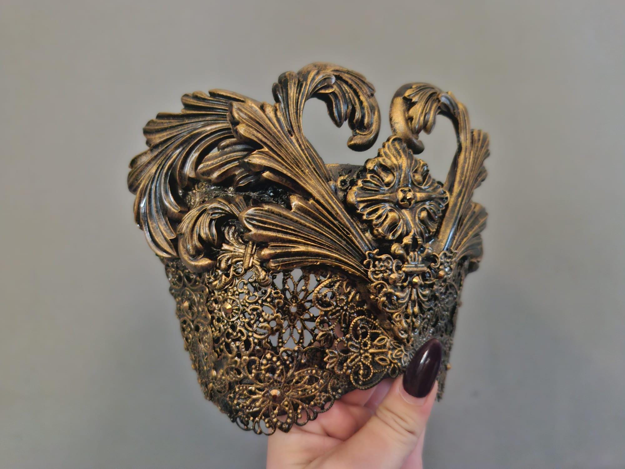 Full of flow details, ornate and a true statement piece. Can be seen through, felt backing. Secured via adjustable elastic.