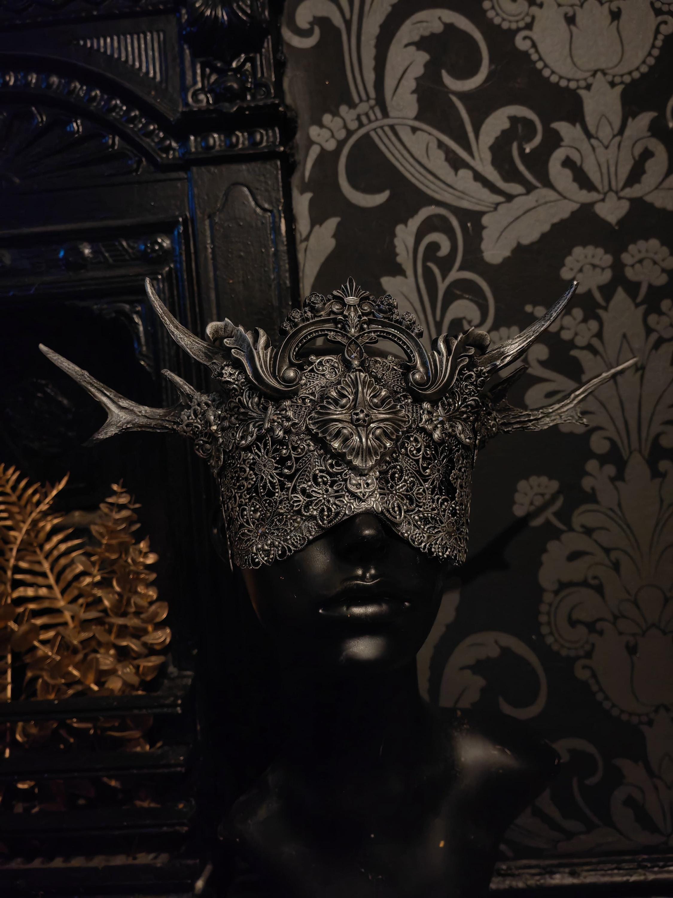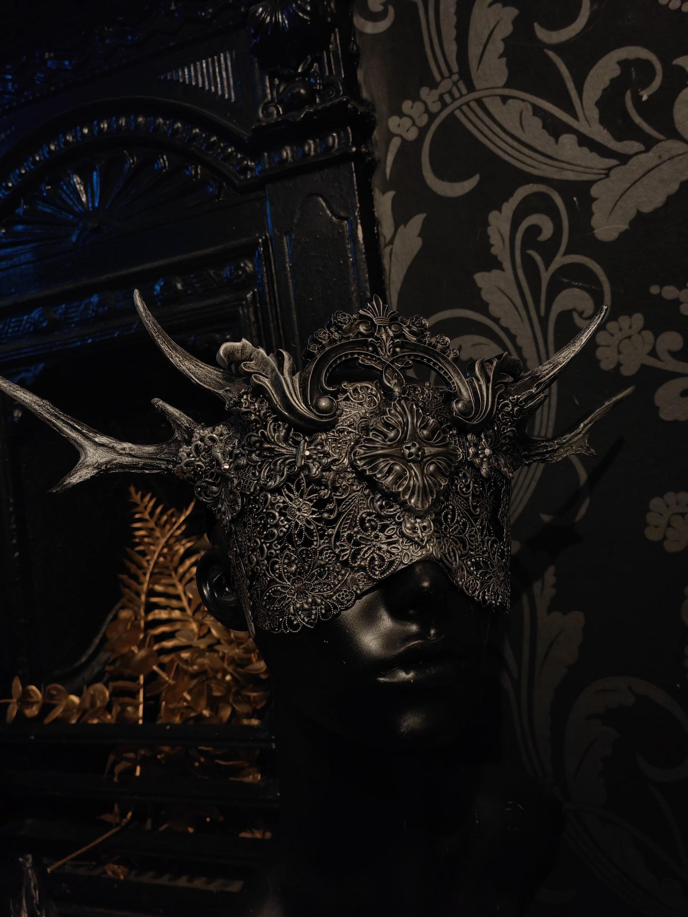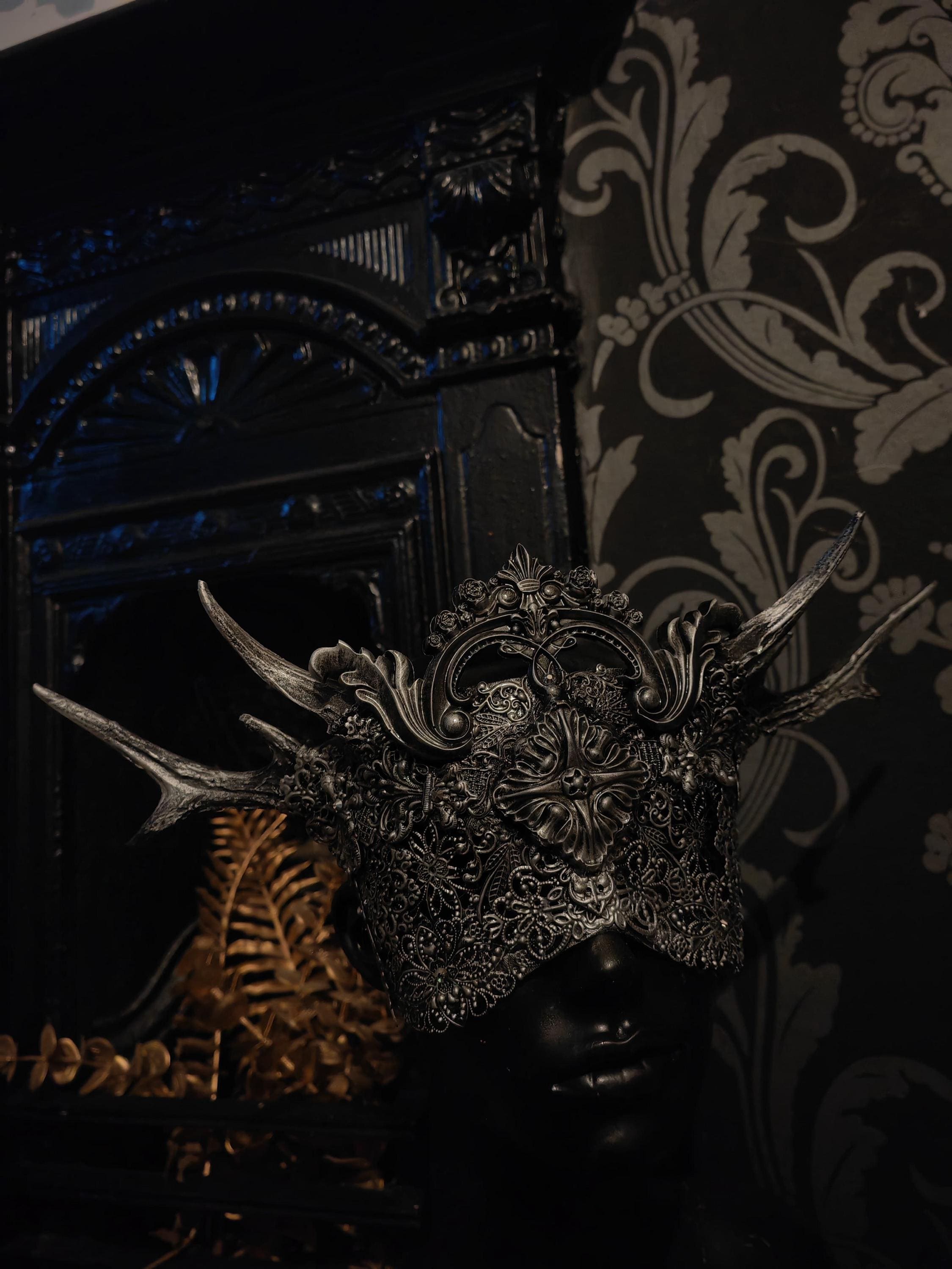 A stunning mask with ornate detailing. Antlers on top of the mask for maximum impact on your outfits. Finished in silver paint. Can be seen through, secured via adjustable elastic.