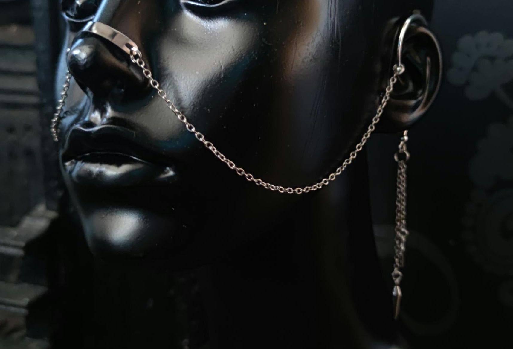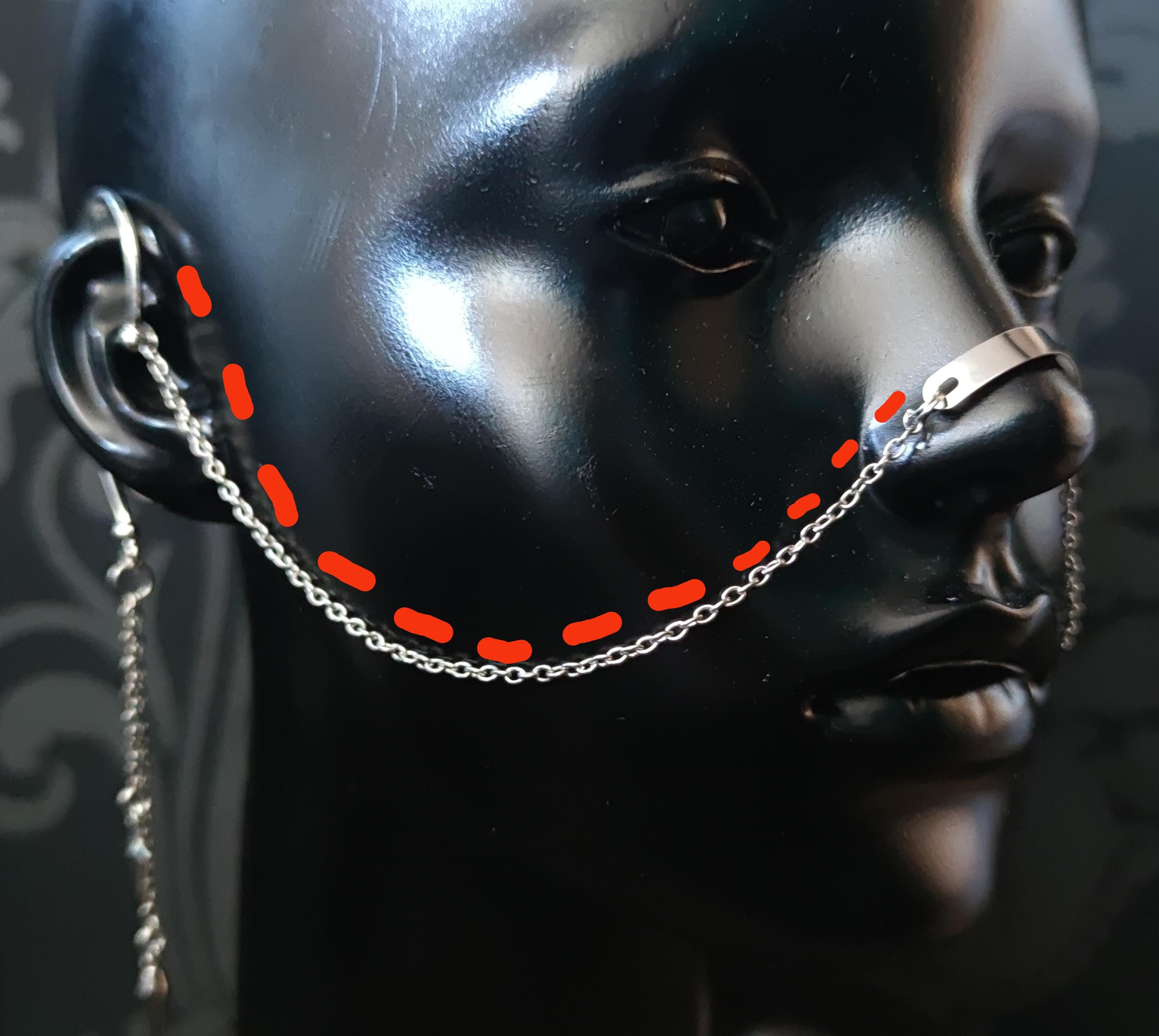 The nose armour simply clips into place around ones ears and sits on the nose so no piercings are required to wear it, also can be worn comfortably with glasses.