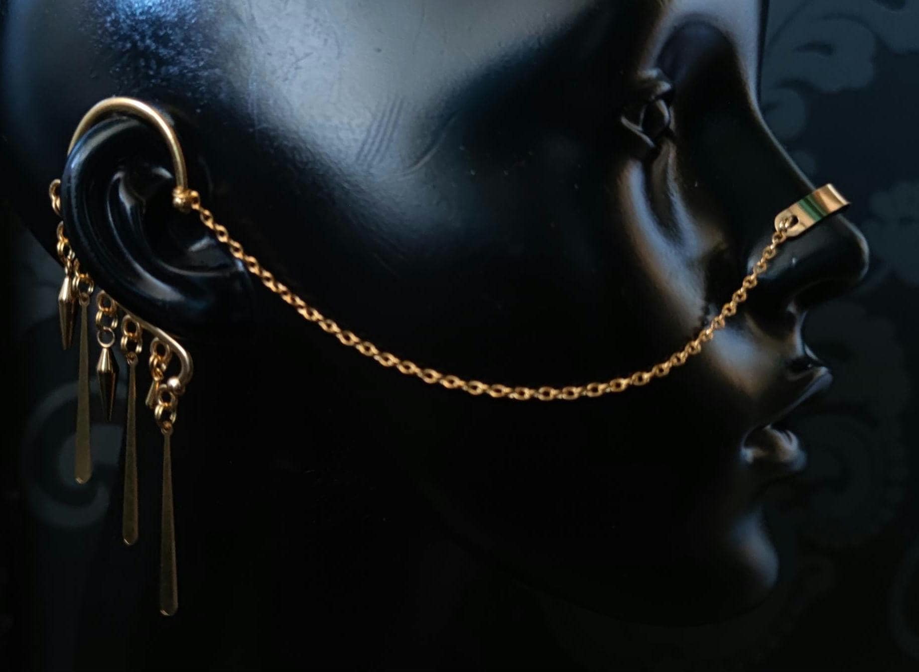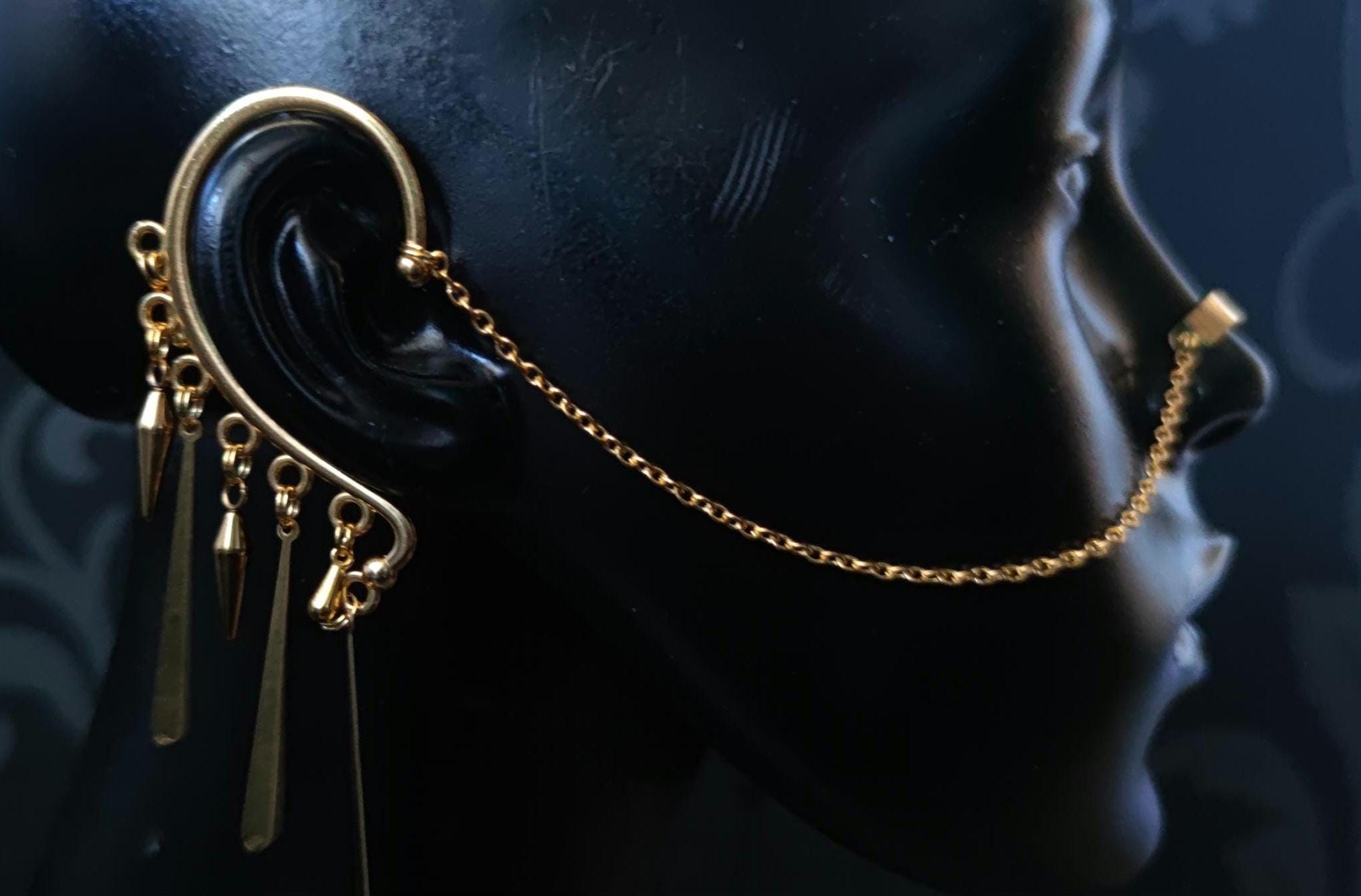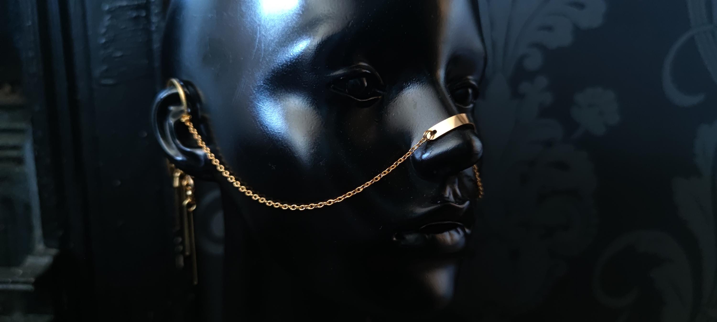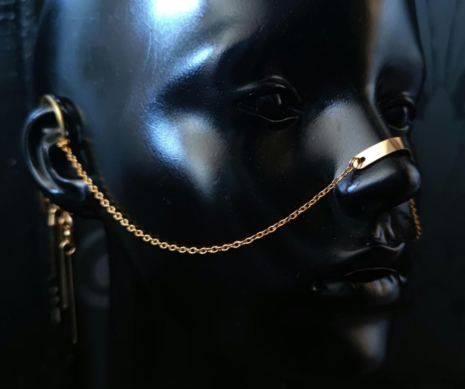 The nose armour simply clips into place around ones ears and sits on the nose so no piercings are required to wear it, also can be worn comfortably with glasses.