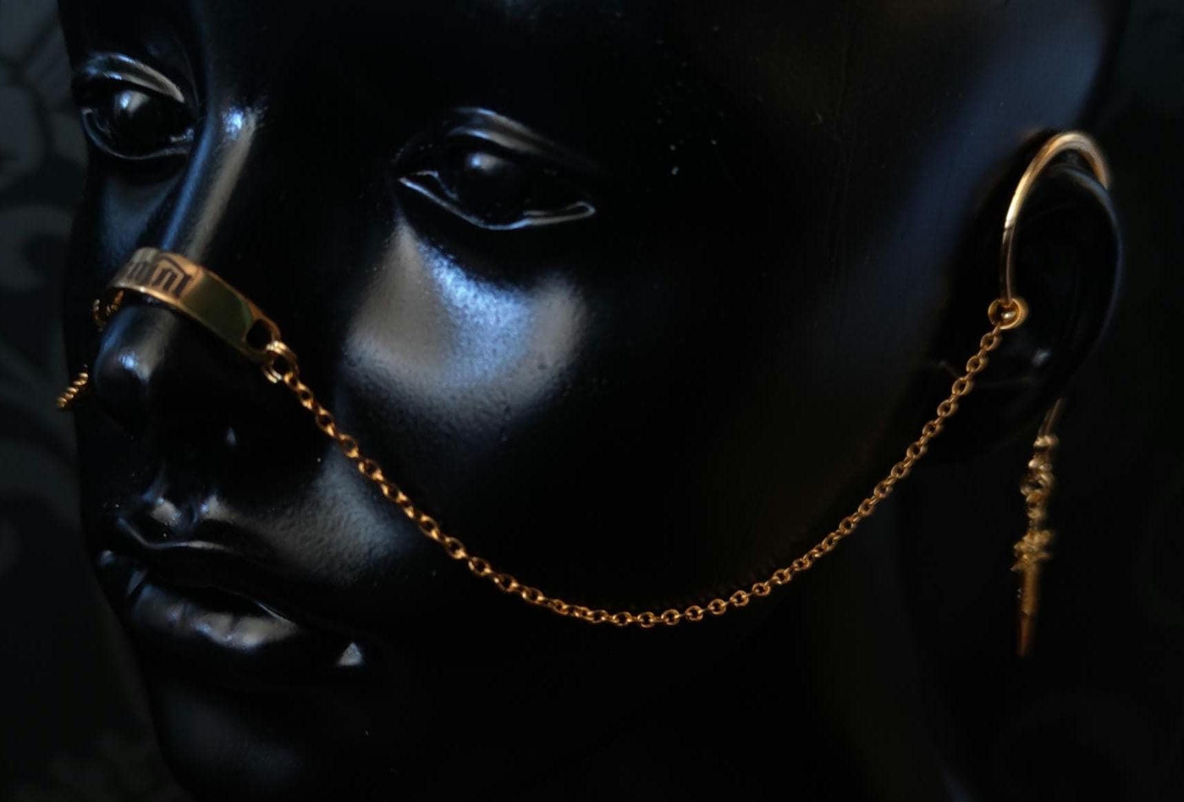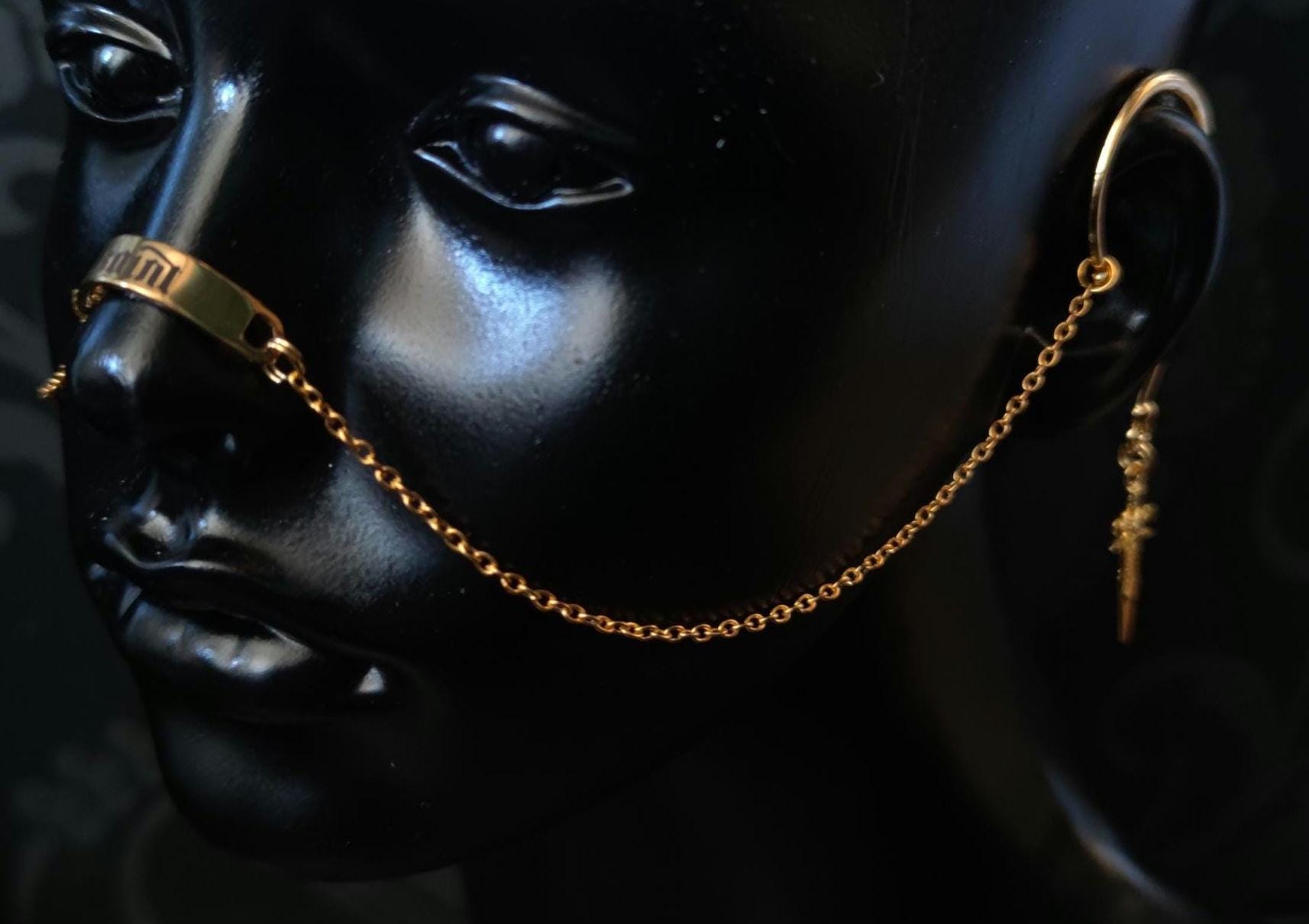The nose armour simply clips into place around ones ears and sits on the nose so no piercings are required to wear it, also can be worn comfortably with glasses.